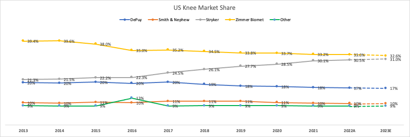 The other big ortho players followed Stryker’s lead and introduced their own total knee robots in 2017 (Smith & Nephew), 2019 (Zimmer), and 2021 (DePuy). These systems followed the same closed platform business model. These follow-on companies were trying to emulate what Stryker did and use robots to leverage surgeons to change implant usage. The problem is it hasn’t worked. This strategy only works for the first mover.