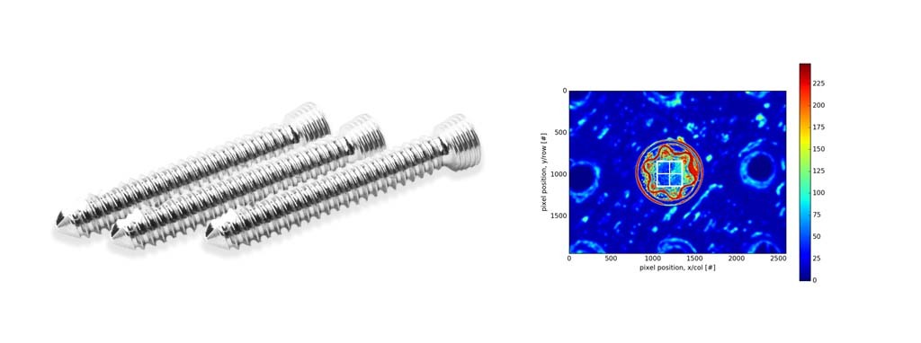 The optical system’s camera moves along a horizontal plane, viewing each implant’s surface from above and selects areas to scan to create the vTag based digital fingerprint. The first step of the process, therefore, was to create a software template for each implant type geometry and to calibrate these templates. Because the eight screw types were similar in shape and size, they could be processed with one template, and five additional templates were needed for the three types of plates and two types of burr hole covers. Once templated, every individual implant was registered with a unique fingerprint (vTag) by scanning its surface. Screws could remain in the surgical tray for scanning, while plates and burr hole covers (which were stacked in the surgical tray) were temporarily transferred to the aforementioned generic plastic tray to make them visible for overhead scanning. A total of 236 unique implants were registered during this step and assigned unique identification numbers, similar to UDIs, with no errors in registration.