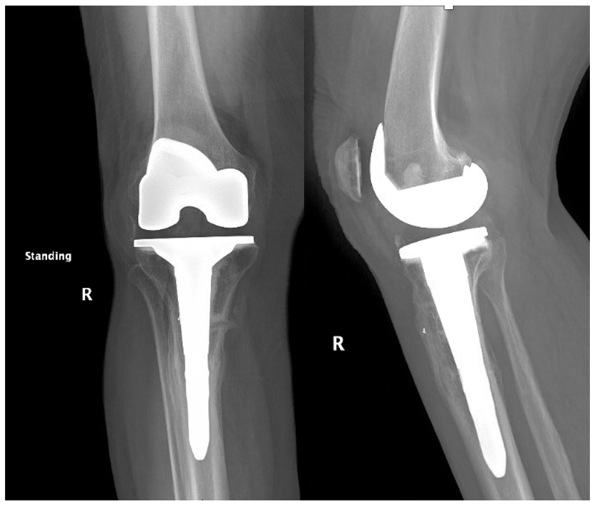 Physical examination disclosed active knee motion from 0° to 110°, a varus thrust during gait, and patellar subluxation near full extension. The collateral and cruciate ligaments were intact, and neurovascular integrity was preserved. Preoperative patient-reported outcomes included a Knee Society Score of 54 (pain 24, function 30) and a Knee Injury and Osteoarthritis Outcome Score for Joint Replacement (KOOS JR) of 49.