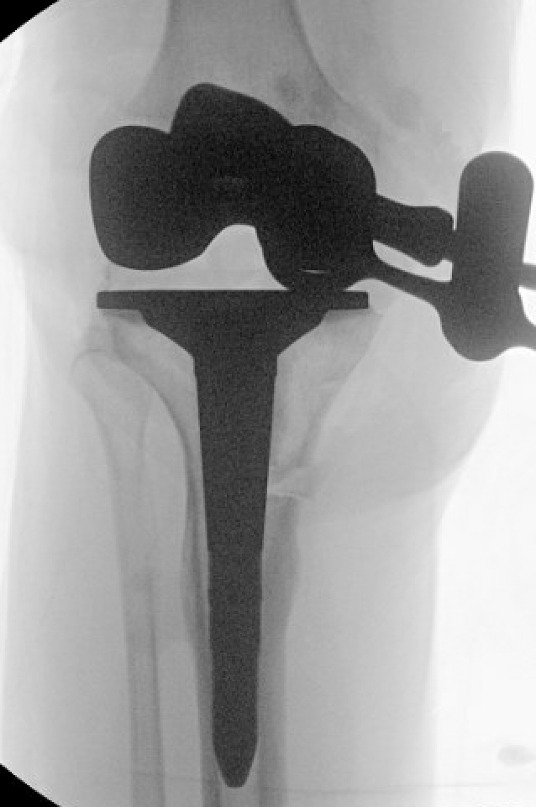 After copious irrigation, the arthrotomy and extensor mechanism were closed in layered fashion over a closed-suction drain. A sterile dressing and a hinged knee brace locked in full extension were applied. The patient was allowed full weight bearing as tolerated with the brace, and physiotherapy was initiated on post-operative day one. Chemoprophylaxis against venous thrombo-embolism consisted of re-initiation of her home medication of apixaban 2.5 mg twice daily.