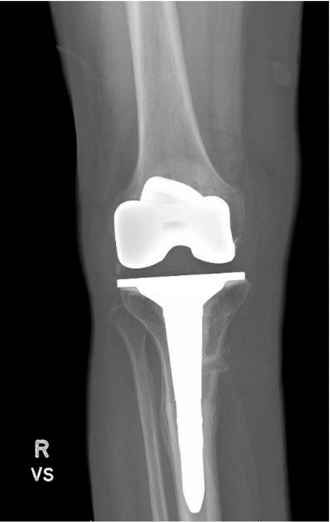 Quantitative range-of-motion and outcome-score data are summarized in Table 1. At the two-week clinic visit the incision was fully healed and sutures were removed. The patient continued full weight bearing in the brace. By six weeks the osteotomy displayed bridging callus across the osteotomy site (Figure 6), the brace was discontinued, and she achieved an unrestricted gait pattern without assistive devices. Four months after surgery, the patient had resumed activities such as tennis and reported no pain or swelling. Radiographs at that time demonstrated complete cortical union without any interval changes in alignment (Figure 7). At the nine-month assessment she reported hiking up to five miles and skiing on groomed slopes without limitation. Imaging showed continued consolidation of the osteotomy and stable components (Figure 8).