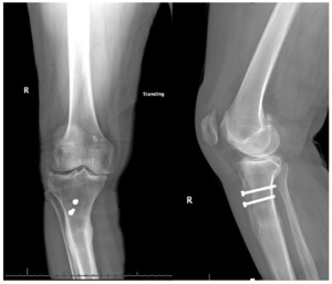 A 60-year-old woman with a BMI of 29 kg/m² presented with worsening right knee pain, intermittent knee buckling, and difficulty descending stairs. Fifteen years earlier, she had undergone a tibial tubercle osteotomy (TTO) at an outside facility to address recurrent patellar dislocation. Four weeks after the TTO, she experienced a fall from standing that caused immediate pain in the upper part of her leg. Initial radiographs taken at the outside facility were interpreted as showing no fracture. However, persistent discomfort led to repeat imaging ten weeks later, which revealed a proximal-third tibial shaft fracture that was already healing in varus alignment. Since the fracture showed bridging callus, no surgical intervention was offered at that time. Over the years, degenerative changes likely developed due to her varus malunion.