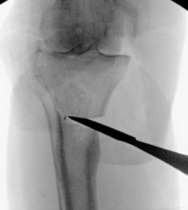 The two TTO cortical screws were removed. Attention then turned to the extra-articular deformity. Under biplanar fluoroscopic control an oblique medial open-wedge osteotomy was created six centimeters distal to the tibial plateau at the apex of the varus malunion (Figure 3). A laminar spreader was gently inserted and opened until a neutral mechanical hip–knee–ankle axis was achieved, as confirmed with an extramedullary alignment rod extending from the center of the femoral head to the center of the ankle mortise.