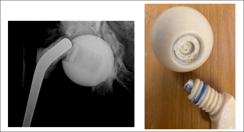 The failure pattern involved a fractured polymethyl methacrylate (PMMA) femoral trunnion tip, which was seated at only 2 threads in the femoral head, while the remainder of the femoral stem, including its internal stainless-steel rod, remained intact and dislocated outside of the femoral head socket. This suggests that the femoral head unscrewed from the femoral stem before fracturing.