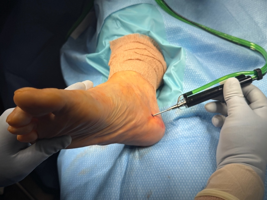 A 3 mm incision was made medially through the skin at the insertion of the plantar fascial band origin from the plantar medial calcaneal tuberosity of the calcaneus. Diagnostic ultrasound was used to visualize the plantar fascia at its insertion. A hemostat was inserted into the incision and used to bluntly dissect through the subcutaneous tissue to the fascial band. A microtip device and console were set for irrigation, medium aspiration, and medium cutting power. The microtip was inserted into the incision site from the medial heel while using ultrasound visualization of the plantar fascia medial band with both the microtip and the transducer transverse to the plantar fascia.