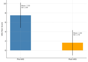 Additionally, 95% confidence intervals (CI) were calculated for pre-operative and post-operative VAS pain scores to help us better understand the potential range of effect sizes, as shown in Table 3. Before treatment with PUT, patients reported moderate to severe pain with pre-operative VAS pain scores falling within a 95% CI of 6.38 to 8.62. Following treatment with PUT, pain levels decreased markedly with post-operative VAS pain scores falling with a 95% CI of 0.51 to 2.77, indicating minimal to mild pain levels. The effect size of the change in VAS pain scores before and after treatment with PUT was also calculated using Cohen’s d. Cohen’s d was found to be 2.17, as illustrated in Table 3. This represents a large effect size, which suggests a clinically and statistically significant improvement in VAS pain scores after PUT.