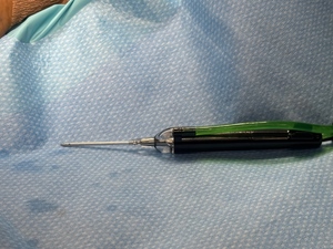 The microtip is continually passed through the medial band of the plantar fascia and debrided for 3 to 9 minutes as seen in Figure 2. The device was removed from the foot, and the incision was closed with sutures. A non-adherent dressing was placed on the incision site followed by gauze, webril cotton, and an ace bandage. Some patients did receive an injection of PRP to the surgical site after sutures were placed. The patient was fitted with a surgical shoe or short boot walker and was allowed to bear weight as tolerated for the first two weeks. Patients returned to the office two weeks for their first post-operative visit for suture removal; they were then allowed to transition to full weight bearing as tolerated in a supportive shoe. Six weeks after the surgery, patients were instructed with home physical therapy or referred to formal physical therapy.