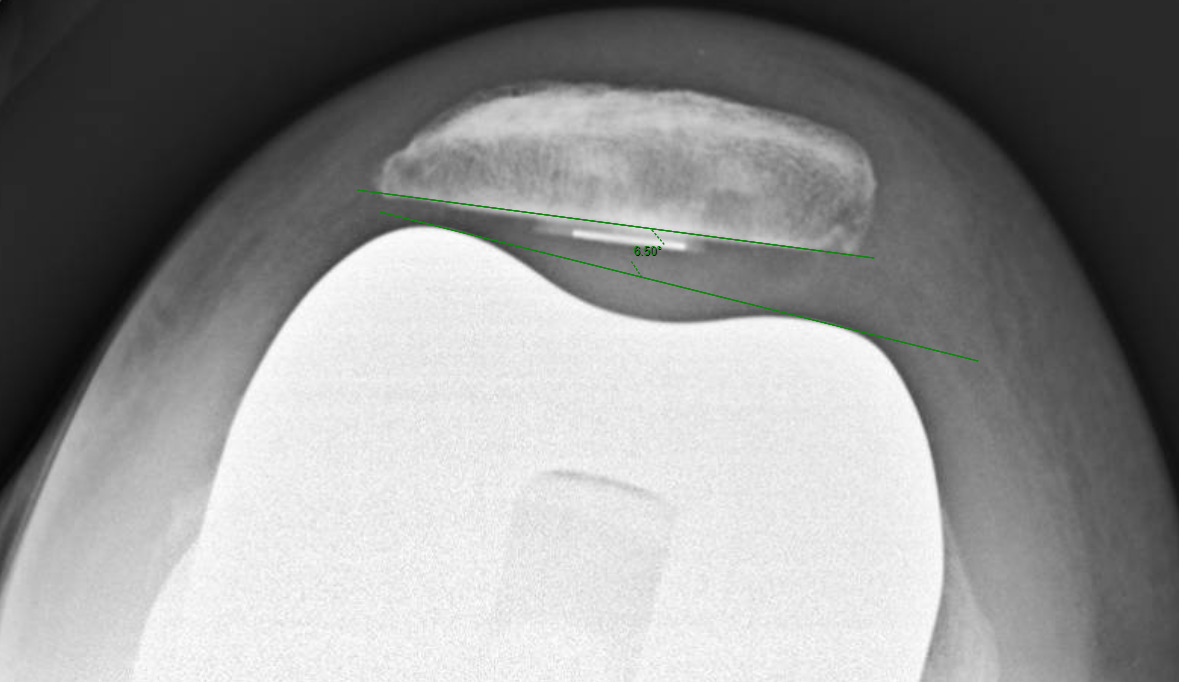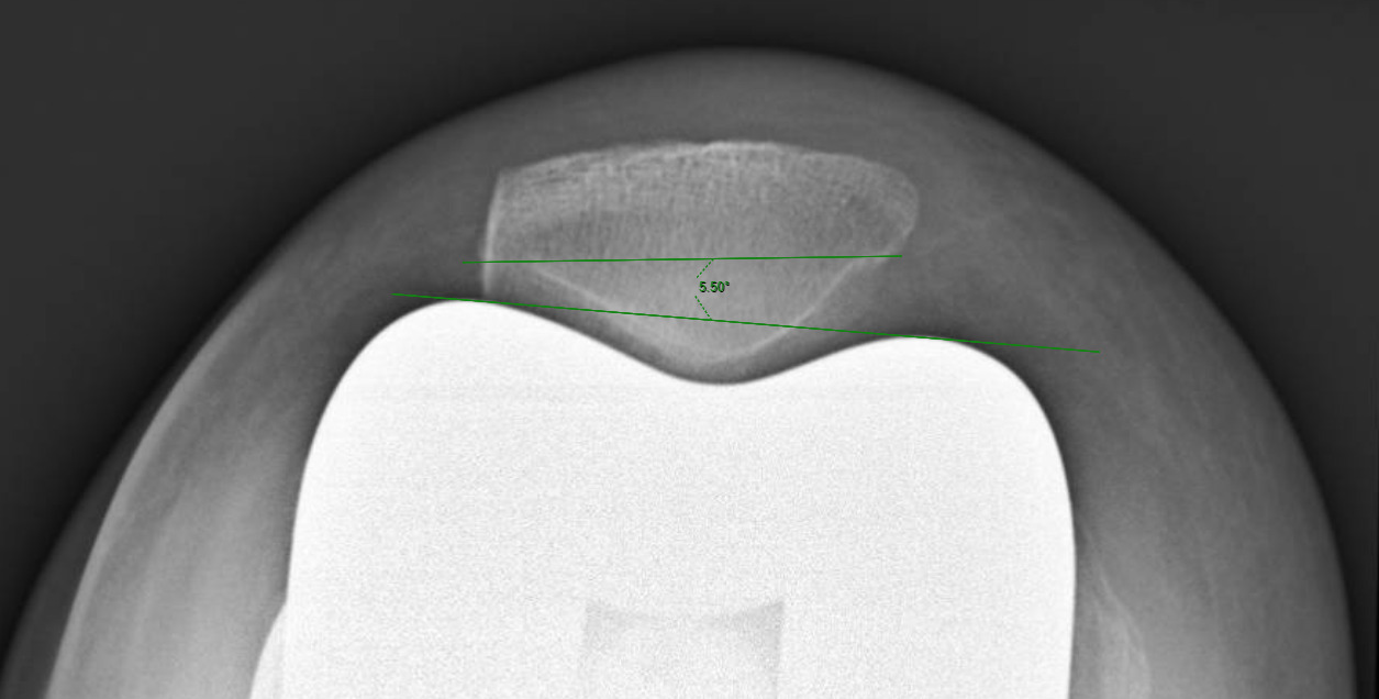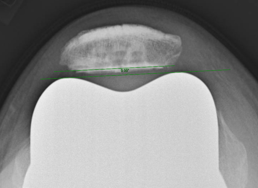 Measurements were performed by one rater following extensive training from the senior author using a standardized measurement protocol. The rater was blinded to the use of robotics when measurements were made. Assessment of postoperative merchant view radiographs on digital imaging software according to the method of Gomes et al. was conducted (Gomes, Bechtold, and Gustilo 1988). The angle between the resected surface of the patella and a line tangent to the anterior condylar axis of the femoral component was measured and recorded (Figures 1-4). The patellar tilt was recorded as positive when the tilt was lateral and was recorded as negative when the tilt was medial. The absolute value of the patellar tilt was used during data analysis as a neutral of 0° was considered the goal for patellar tilt during surgery, and both increasing lateral and medial tilt away from neutral were considered as increasingly imperfect. The percentage of outliers where the patellar tilt exceeded 3 degrees off neutral was also calculated for each group.