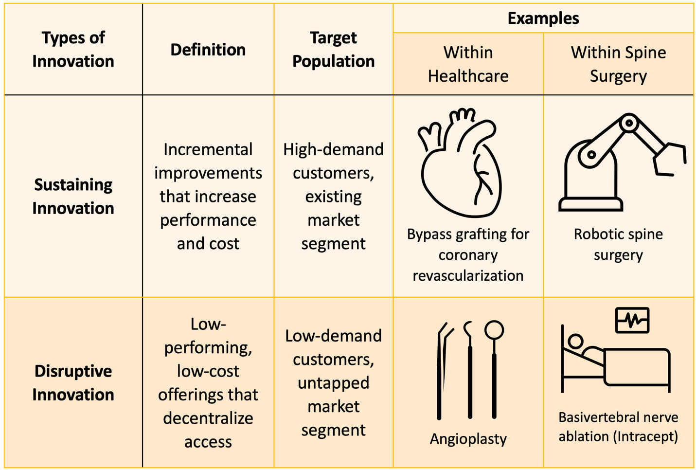 Spine surgery is replete with research on novel tools to improve existing operations. Navigation and robotics, arguably two of the most well-studied advancements in spine surgery in recent years, are the best example of this notion. These technologies enable improvements in the accuracy and safety for spinal instrumentation placement (Overley et al. 2017; Sarikonda et al. 2024), while empowering more surgeons to tackle complex spinal deformity operations that previously were only the purview of select specialists. Nonetheless, robotics and navigation are largely centralized in operating rooms and do not enable spinal fusion surgeries to be accessed by new segments of patients. As such, neither robotics nor navigation appeals to patients who are unwilling or unable to undergo fusion surgery. Although these technologies do appear to improve reproducibility and standardization, they ultimately serve as sustaining innovations that facilitate the execution of pre-existing procedures (Beyer et al. 2023; Ghasem et al. 2018). Robotics have also been shown to incur significant intraoperative expenses for common spine procedures (Sarikonda et al. 2024), which complicates deployment in ambulatory or resource-poor settings. For these reasons, navigation and robotics are examples of sustaining (rather than disruptive) technologies.