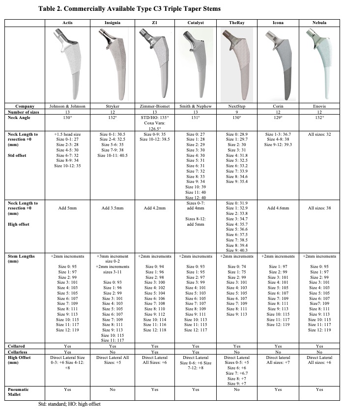 The AJRR 2024 Annual Report (N=943,690) identified that the utilization of modern Type C3 triple taper stems continue to rise (Carender et al. 2025). Type C3 stems were used in 7% of primary THA in 2018 with exponential growth to nearly 30% by 2023 while the other stem designs has progressively declined over the last 5 years (Carender et al. 2025).