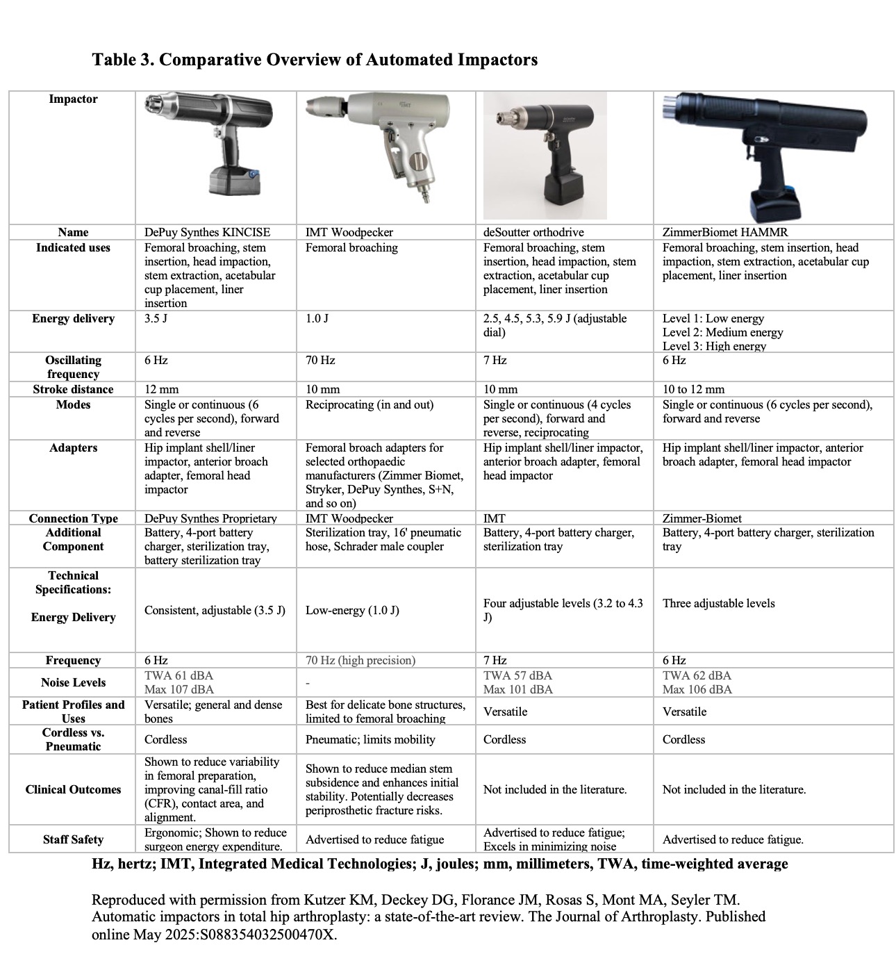 Early clinical data indicate that automated impaction systems may improve femoral component seating, increase canal fill ratios (CFRs), and reduce operative time (Kutzer et al. 2025). Moreover, when used with contemporary implants, such as Type C3 stems via the DA approach, these devices may help lower the incidence of femoral and acetabular fractures (Kutzer et al. 2025). Despite their growing use, automated impactor systems differ in design, functionality, and clinical utility. The most common commercially available devices for femoral canal preparation are summarized in Table 3 (Kutzer et al. 2025). Recent studies have suggested automated impaction has consistent advantages in stem preparation consistency and risk reduction compared to manual broaching as summarized in Table 4. (Kutzer et al. 2025)