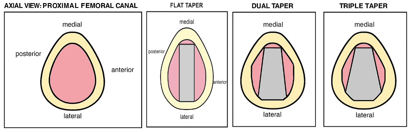 These femoral stems exhibit a quadrangular cross-sectional geometry where initial rigid fixation is achieved in the metaphyseal and proximal diaphyseal regions, particularly in the coronal plane, while providing greater engagement in the sagittal plane when compared to single taper designs. This configuration facilitates a more uniform distribution of mechanical loads across the proximal cortical bone and contributes to enhanced torsional stability (Figure 1). These implants are typically intended for insertion using a broach-only technique and are classified into three distinct subtypes (Radaelli et al. 2023).