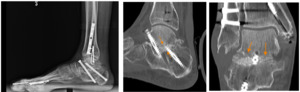 Radiographic evaluation (X-Ray and CT Scans) at this 3-month timepoint showed intact and well positioned screws and evidence of early and complete consolidation of the bone graft (Figure 2). At this point, the patient returned to full weight bearing and was able to walk free of pain with regular shoes. There were no complications noted during surgery or post-operatively.