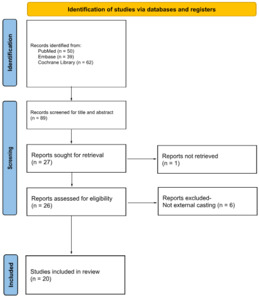 A total of fifty articles published between 2015 and 2025 were retrieved from initial search results across the aforementioned electronic databases. Studies were included if they assessed 3D-printed casting for the conservative management of musculoskeletal injuries. Of these, twenty articles met the inclusion criteria and were organized by study design, patient outcomes, and biomechanical findings.