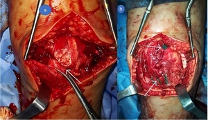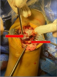 In both cases, the inferior pole of the patella demonstrated an avulsed osteochondral fragment involving approximately one-third of the articular cartilage and half of the periosteal surface. The patellar retinaculum was found to be torn and shredded, which complicated visualization, a finding commonly associated with sleeve fractures. Reduction was achieved under direct vision using reduction clamps to restore the patellar tendon–bone continuity and anatomical alignment of the osteochondral fragment.
