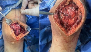 Both patients were placed supine on a radiolucent operating table under general anesthesia, with a pneumatic tourniquet applied to the proximal thigh. The affected knee was positioned in full extension, prepped, and draped in a sterile fashion. A midline longitudinal incision was made over the patella and extended distally to expose the inferior pole. Hemarthrosis and interposed tissue were evacuated.