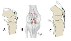 In this study, a patellar sleeve fracture requiring surgical repair of the osteochondral fragments is described. A schematic illustration of the transosseous sutures is presented in (Figure 1B and C). In all cases, informed consent for treatment and publication of anonymized data and images was obtained from the patients’ parents or legal guardians. Institutional approval was also secured in accordance with ethical standards.