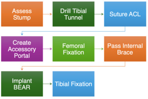 Surgical intervention was performed 6 weeks after the initial injury. Examination under anesthesia confirmed a positive Lachman test, grade 2+, without a definite endpoint.. Portals were created on the knee, and the joint was insufflated with fluid for diagnostic arthroscopy. The patellofemoral joint was in excellent condition, with no indication of medial or lateral meniscus tear or chondromalacia. At this point, the ACL stump was recognized and preserved, and the over-the-top guidance was used to locate the ACL’s origin on the femur. A Beath pin was then easily inserted, and a suture was used for later internal brace suture passage. The tibial tunnel was then created just anterior to the tibial stump. A fibrous anteriorly flipped ACL tissue remnant was identified at this point, and the stump was whipstitched using a suture passing device, and the cyclops was incorporated into the repair. The button was then brought onto the table, and the stumps sutures were carried up and through the button before passing through the lateral femoral cortex. An open arthrotomy was subsequently created to facilitate ACL repair and restoration. At this point, the sutures from the femoral button were passed down and through the BEAR implant, and 20 cubic centimeters (cc) of whole blood was splayed over the implant (Video 1a-b). Sutures from the implant were then passed down the tibial tunnel, and the BEAR implant was digitally inserted through a larger open medial arthrotomy incision for ACL repair and restoration. After positioning the BEAR, the knee was extended fully, and sutures through the BEAR implant were inserted into another button through the open tibial incision. Sutures were then tied down over the tibial button, and 3-0 Monocryl was used to close incisions. The sequence steps of the BEAR surgical technique are summarized in the flow chart (Figure 5)
