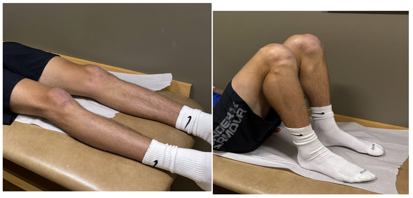 Postoperatively, the patient was placed in a postoperative hinged brace with a fixed range of motion of 0 to 90 degrees. Crutch protocol was instituted, and the patient remained non-weight bearing for the first 2 weeks. At follow-up, the patient showed primary healing at all incisions, an appropriate range of motion (0-90°), and continued current brace settings and was advanced to 50% partial weight bearing for the following 2 ½ weeks. Strengthening exercises with physical therapy began 2 weeks post-operatively per the recommended postoperative BEAR physical therapy protocol, focusing on pain and swelling. The following four phases consisted of closed chain strengthening, low impact cardio, plyometrics, and return to sport functional testing over a 6-8 month period (Shah et al. 2025).