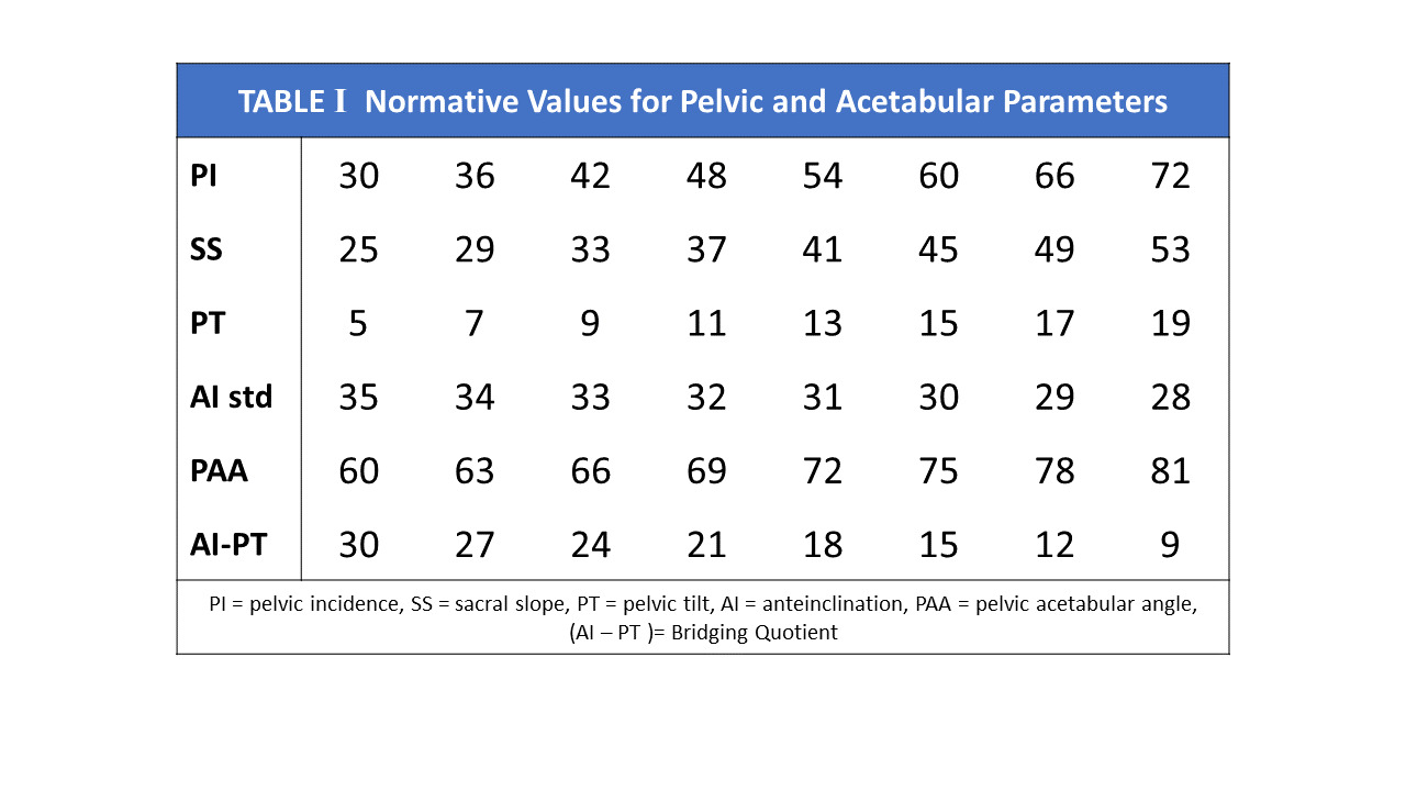 AI, SAA and PAA normative parameters have been adopted using linear equations describing normalized SS and PT relationships for any given PI (Bodner 2022). These equations, SS=0.67PI+5 and PT=0.33PI-5 define that for every 10° change in PI, a normal SS changes 6.67° and PT 3.33°, describing angular ratios of change as 3:2:1 for PI:SS:PT.. Normative values are defined when the cup shares an identical angular relationship to both SS and PT. At this orientation, the triangle’s acetabular angles SAA and PAA become equal at (90+PI)/2 each, this balanced hip-pelvis state creating an isosceles form for the triangle. This value is valid for a static standing position and remains unchanged only when the pelvic mobility between standing and upright seated postures is 25°. The resultant AI cup angle, the sole remaining unknown in the system becomes discoverable as a simple algebraic calculation using either SAA or PAA (Table 1).
