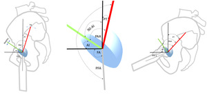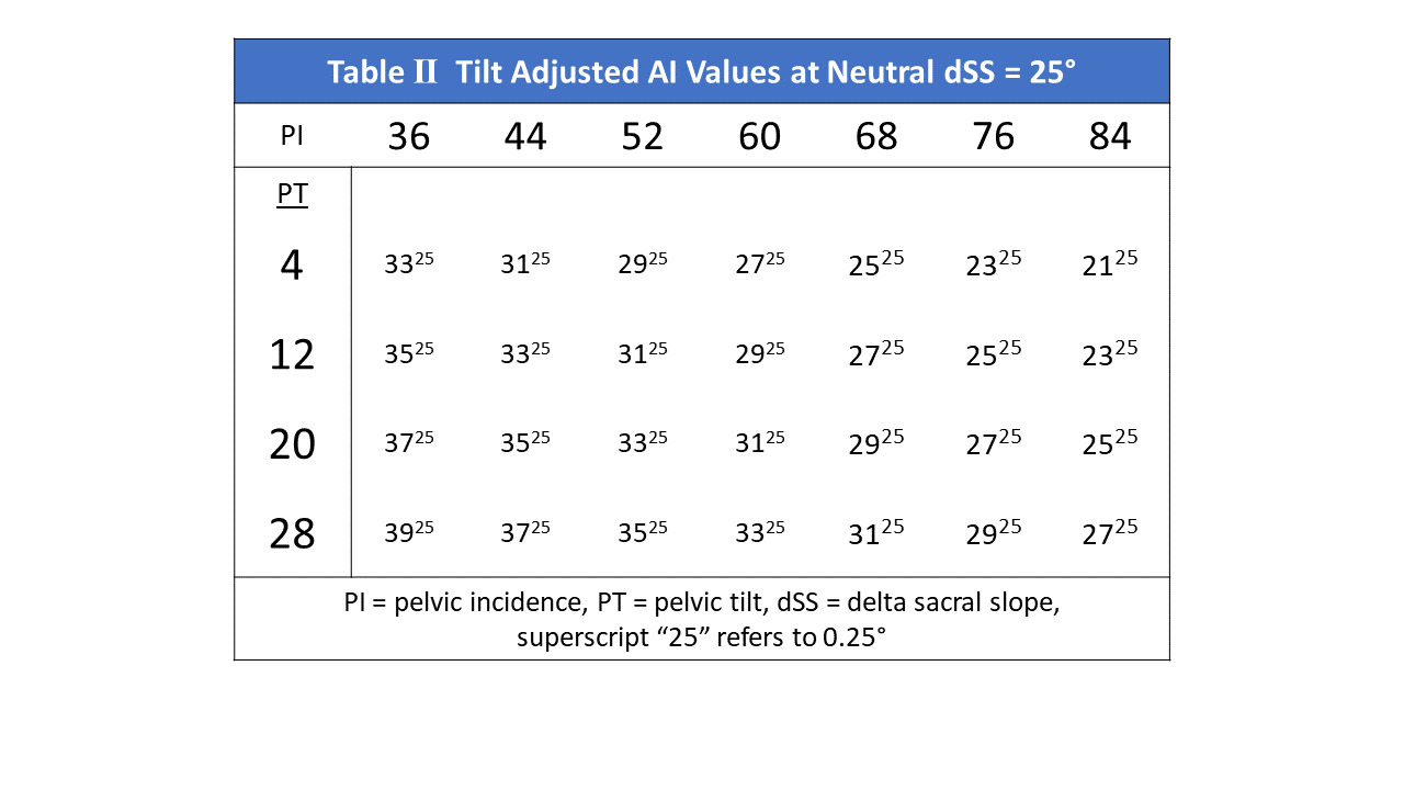 Employing PT, cup tilt adjustment is calculated for every 1° the measured PT diverges from the normalized position; in similar fashion to coronal tilt adjustment performed for divergence from a neutral APP pelvic position. The ideal standing AI becomes discoverable by Standing AI= 90-(PAA-PT). Finally, 90-(AI-PT) will confirm the individualized tilt corrected PAA angle and its reciprocal SAA angle.
