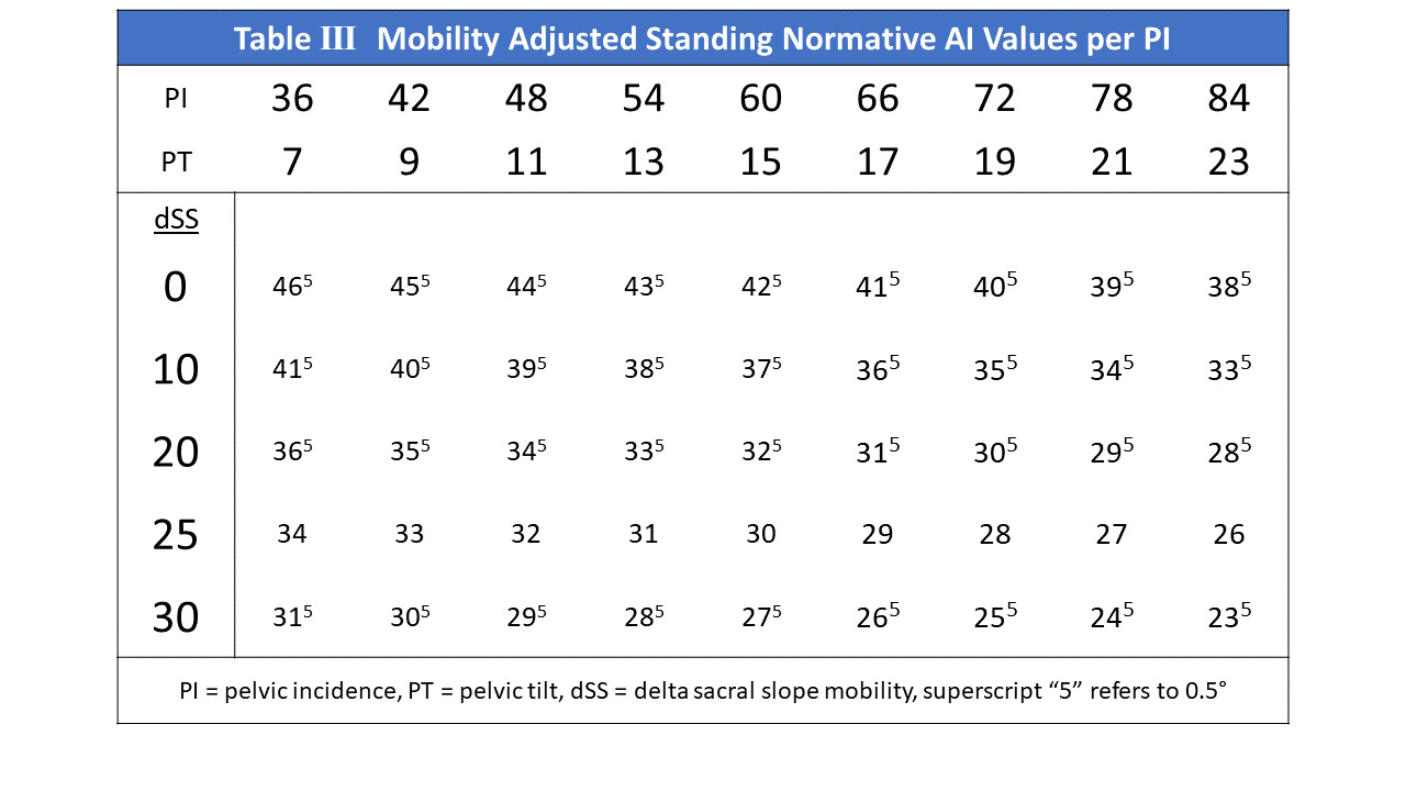 Table 3 demonstrates the mobility adjusted AI cup angles for normative PT values for any PI. The normative values creating the isosceles triangle condition are those in the 25° mobility row. As explained, a 1° increase in mobility will decrease the standing AI 0.5° for any PI and PT, a 6° increase in PI and 2° increase in PT will decrease the optimal AI 1° in standing. Mobility has the same effect on the AI value in the (AI-PT) quotient; for a given PT, a 1° increase in mobility lowers the AI 0.5° lowering this quotient by 0.5°. This results in increasing the PAA 0.5°, decreasing SAA 0.5° reciprocally.
