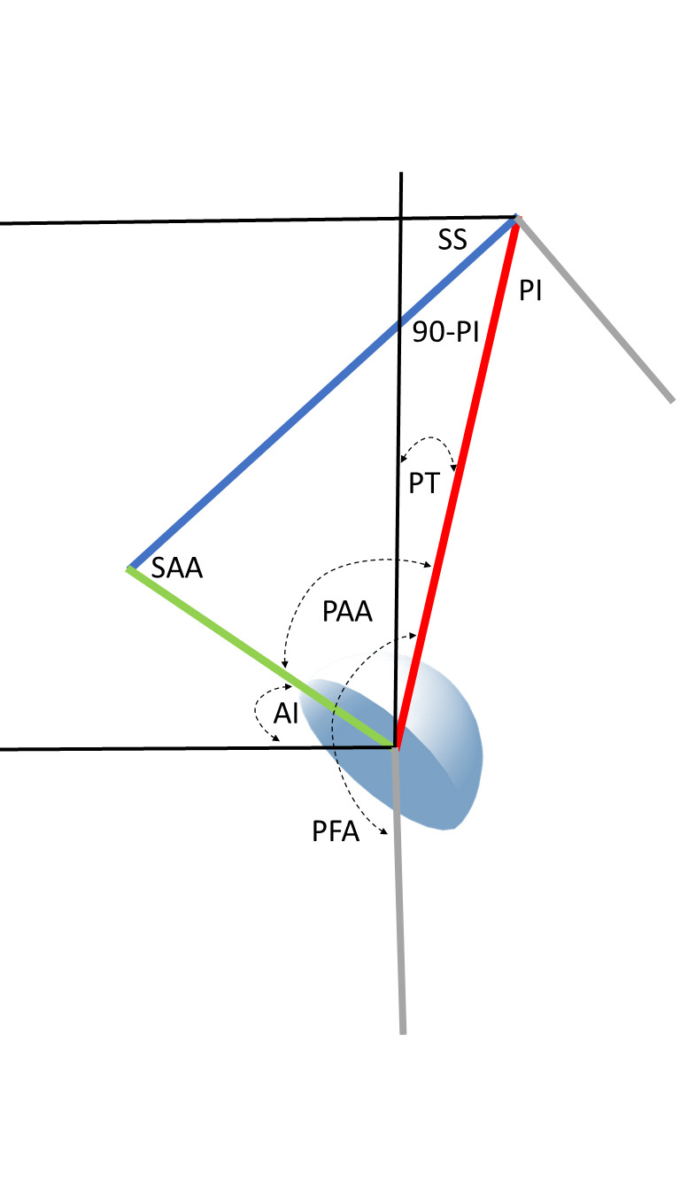 Functional cup positions have been determined by the spatial position of the pelvis in standing and upright sitting using SS angles measured at the S1 endplate (Kanawade, Dorr, and Wan 2014). Calculations are geometrically simple using the SS as it shares the horizontal reference with AI, (SAA=AI+SS). Determination using the PT requires employing complementary angles including (90-AI), a constituent of the PAA, as again PAA=(90-AI)+PT. Rewriting the equation, PAA=90-(AI-PT) uses the very same bridging cup to pelvis quotient as found in the SAA equation, SAA=PI+(AI-PT).