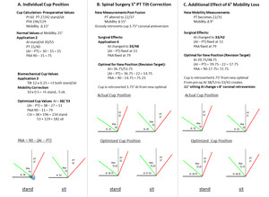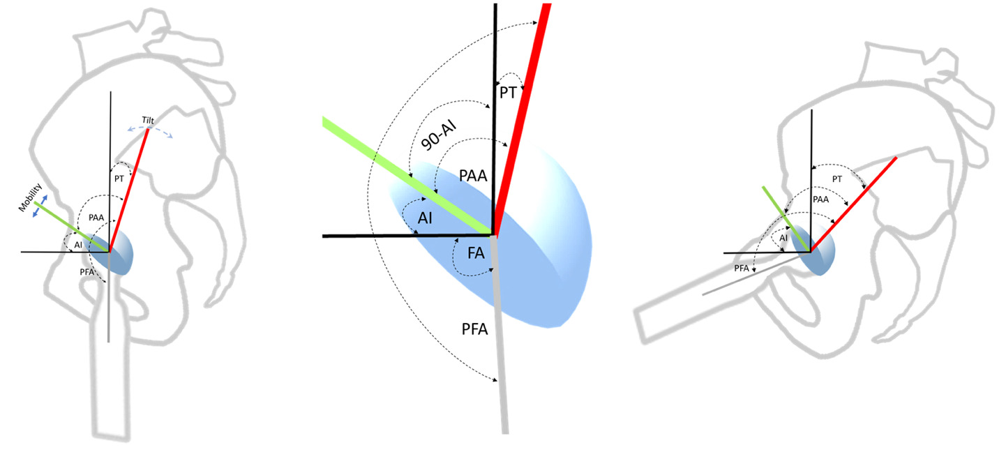 Balanced postures are governed by control of the body’s line of gravity in the sagittal plane, requiring coordinated movements between the spine-pelvis-hip complex (Lazennec, Brusson, and Rousseau 2011; Dubousset 1994; Schwab et al. 2006). Positional changes to sit or bend require considerable mobility between these regions, accomplished through pelvic rotation about the hip joint, spinal shape change, and horizontal translations called shifts (Stefl et al. 2017; Diebo et al. 2016; Ferrero, Liabaud, Challier, Lefage, et al. 2016; Lazennec et al. 2020). As functional awareness grows in both hip and spine surgery, it becomes crucial to develop a common language in which procedures on one side of the pelvis can be understood in terms of effects on the other. This is difficult with the sagittal standing priority in spinal planning and the supine coronal plane paradigm in THA (Masquefa et al. 2015; Liu et al. 2019) APP-derived tilt adjustment in THA planning has been an accepted method of coordinating cup position to that of the pelvis. Intrinsically however, these relationships are quantitatively defined by the equations for the SAA and PAA angles, determining a functionally constant optimal angular relationship of a hemispheric cup to measured or predicted SS and PT values respectively. Postural control has been shown to be modified through PT and PFA, the latter highly correlated with the spinal T1 Pelvic Angle of truncal inclination, (TPA), and PT is an important parameter within corrective spinal planning (Lafage et al. 2009; Protopsaltis et al. 2014). The quotient, (AI-PT) represents a bridge between the tilt and mobility sensitive cup orientation and the functional morphology and orientation of the pelvis, adding (AI-PT) to the PI produces SAA or subtracting it from 90° produces PAA. The key biomechanical concept is the angular ratio of the cup change to pelvic position change differs when planning to place a component freely into the pelvis than when it moves within the pelvis after it is implanted. Acetabular implantation creates new fixed anatomic relationships, functioning as the adjacent segment to the lumbar spine and sensitive to subsequent spinal surgical changes altering pelvic tilt and/or mobility. In a sense, spinal surgery can create an unwitting THA revision of cup orientation and function.