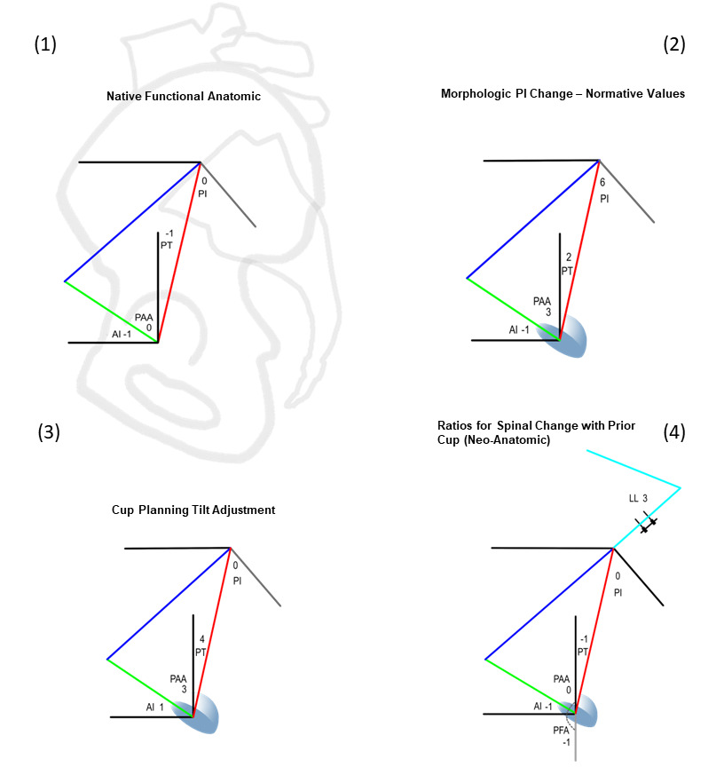 The integration of the pelvic parameters used in spinal surgery, PI, SS, and PT with the sagittal cup angle AI and the angular relationships of the cup AI to the SS (SAA) and to the PT (PAA) function as a tool to answer different spinopelvic questions. This is accomplished by inserting the angular relationships between the parameters found in any physical situation, such as in the native pelvis where all the mobile parameters are fixed within the pelvic bone, thus SS, PT, AI, even the extraneous APP all move in a 1:1 fashion and PI is a constant. 4 different applications are shown in Figure 3 as the relationships in native anatomy, the normative relationships for any PI value, the relationships for calculating a tilt adjusted AI cup position, and the relationships when spinal surgery repositions the pelvis with a preexisting cup already in place. For simplicity, only the angular ratios for parameters crossing the hip joint associated with the PT side of the pelvis are shown, novel development of PT based parameters is the focus of this work.