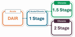 For acute infection (within four weeks of symptoms or within six weeks of index surgery), debridement, antibiotics, and implant retention (DAIR) is most commonly used. Anything beyond that timeframe requires either a one-stage exchange, the traditional gold standard two-stage exchange, or for some a 1.5 stage destination spacer.