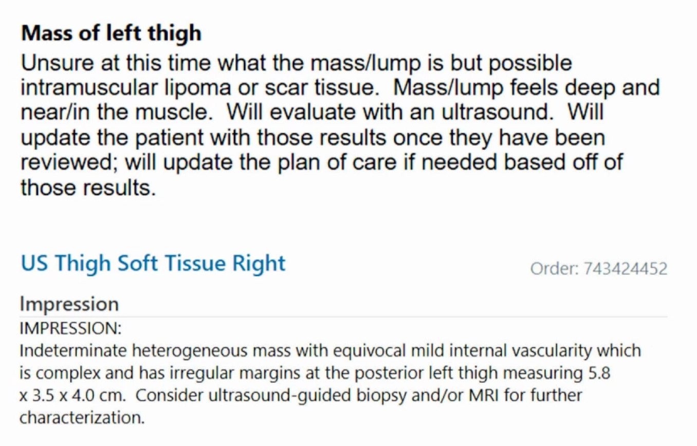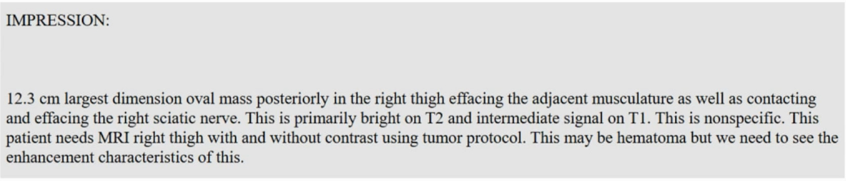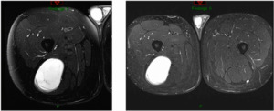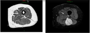 Unsure what it is? Intramuscular lipoma? Intramuscular lipomas aren’t firm and they aren’t hot. Ultrasound for that? The “gold standard” would be an MRI, not an ultrasound, but they did ultrasound it. The ultrasound came back with, “should get an MRI.” But they biopsied it instead. An MRI was then obtained after the biopsy. (Figure 5)