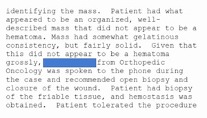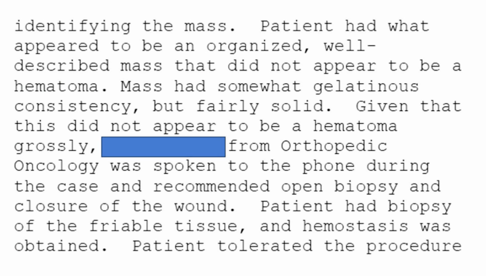 This was done without contrast. The radiologist says you should “do it with contrast.” But the surgeon said, “I’m going to take it to the OR.” Below is the OR note obviously redacted. (Figure 3)