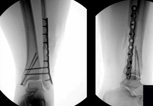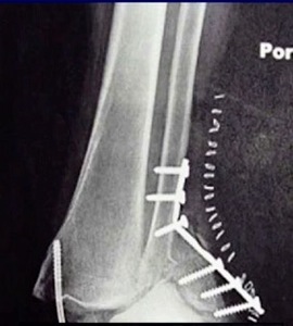 There’s much controversy in terms of should we wait or should we allow acute weight bearing following fixation of an unstable ankle fracture. Traditionally, patients were kept non-weightbearing for 6-12 weeks in some kind of cast or a boot. Nowadays, more contemporary approach is to allow earlier mobilization and protected weight bearing. Additionally, there’s many differences between North American and European schools of thought. When I give this talk to Europeans, they say “yeah we start immediate weight bearing all the time, that’s the standard.” But it’s certainly not the view in North America. I still see patients that have a beautiful x-ray with everything fixed and they’re kept in a cast for two months, which potentially defeats the whole point of surgical fixation. The benefit of surgery is to allow early mobilization and protected weight bearing. This practice can accelerate your patient’s return to work and return to life. However, nobody wants to see this x-ray in their clinic, especially with the staples still in (Figure 3).