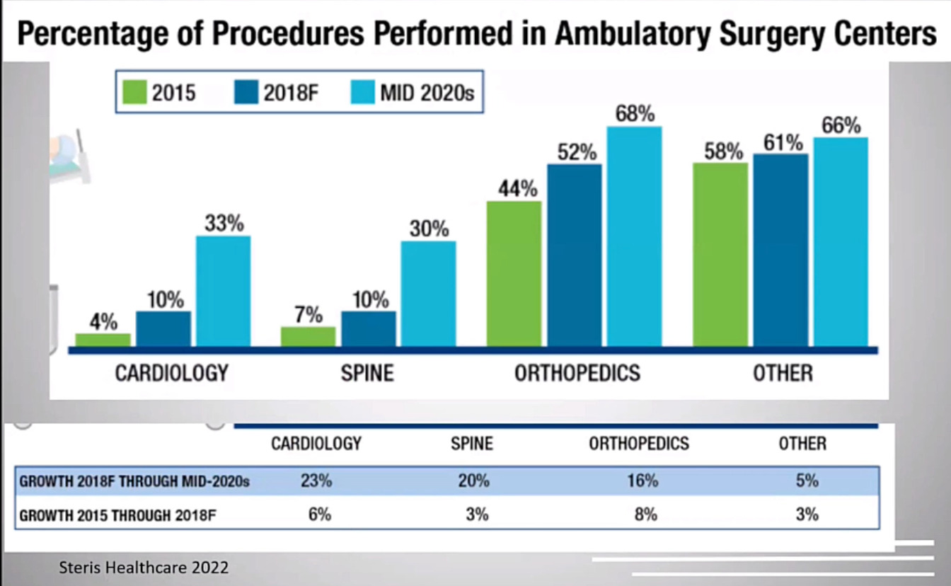 I was also the chief medical officer and part of the board of directors for a regional surgery center company for about five years, and we were publicly traded. My practice itself is a private practice. It’s very community based. We do a lot of outpatient care. I have a lot of sports partners, so this type of practice works well in a surgery center setting. We’re very dependent on the ancillary revenue from the surgery center to make our private practice feasible. Just as some background, as you probably all know, surgery centers and the surgery center industry have grown a lot in the last 10 to 20 years. We have better technology that allows us to operate more in the surgery center. It’s better for patients and physicians and it allows us to control some healthcare costs. This data just shows that we’re doing more cases in the surgery center over the years and that’s the case for all specialties, particularly spine going from about 7% to 30% in the last couple decades of cases done in the surgery center. (Figure 1)