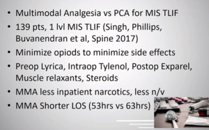 As a framework, we’re going to talk about the clinical and the financial aspects of ASC spine surgery. We’re going to talk about the benefits and the challenges from a clinical perspective, and the benefits and challenges from a financial perspective. That’s kind of how this will flow. So starting with kind of the clinical benefits of ASC spine surgery, the good stuff. So healthcare is becoming increasingly a consumer driven industry. We have an active, older population that has a lot of access to information through the internet and marketing and the financial burden of healthcare is being shifted to patients through higher deductibles and more copay. So our patients have higher expectations and want greater care. And the surgery center is really a consumer-oriented center of care, generally because of higher volumes and being specialized. We can do these cases in an efficient way with a more predictable schedule, and that results in better satisfaction for our patients. When we look at the data of the cases that we do in a surgery center, such as lumbar decompressions, laminectomy and discectomies, and cervical disc replacements and cervical fusions we can do those in a surgery center with equivalent outcomes to the hospital and some data even shows better rates in terms of complication and outcome.That’s often because we have patients in the surgery center that may be lower risk with less medical problems. But what we do know is we can do these cases just as well in a surgery center without compromising patient care. As a physician, when you work in a surgery center, you generally have control over the center. You’re treated more like a customer with a shorter turnover, better equipment and just generally a better work environment because we’re often invested in the center and we have a lot of efficiencies and surgeons like that environment. So what about the challenges of being in a surgery center as you migrate patients from inpatient to the outpatient? There are a lot of challenges to be aware of. Let’s start with what cases are best for the surgery center? So are not instrumented spine cases like laminectomies and micro discectomies are a good place to start. If we’re going to do cervical surgeries like an ACDF or cervical disc replacement one and two level surgeries for those are done well in a surgery center. Those are probably the best cases to start within a surgery center as you become more comfortable you can do possibly lumbar fusions particularly minimally invasive fusions like T-lifts or laterals.Those could all be done in a surgery center in the right situation. Obviously they are being done by a lot of people. As you transition to a surgery center, you want to keep a lot of things in mind. You have to select the right patients, be aware of comorbidities, like cardiac issues or sleep apnea that may prevent that patient from being a good candidate for the surgery center. We need to educate our patients from the beginning, discuss pain management, we want to make sure that they have help when they get back home after the case. My whole team needs to be involved, including people in my office and the anesthesia staff. Everyone needs to be sort of on board with the right environment so patients understand these cases can be done well in a surgery center. It’s good to have a backup plan if we need to admit a patient and we want to start slow. There’s always a learning curve when we do these things. That slide’s not too helpful. So, moving on, if we think about the reasons why patients do stay in the hospital overnight after spine surgery, it’s usually medical reasons like diabetes, heart disease and then other having a durotomy or severe pain afterward. So we kind of have to have a plan for each of these issues. If we’re going to do a case in the surgery center and a patient has sleep apnea or we get a durotomy, what is our plan in the surgery center?It’s best to kind of define these pathways when we’re doing these cases in a hospital and then as we transition to the surgery center kind of having all of those possible outcomes planned for. Pain management is a big issue. This is a study from Rush that shows using multimodal analgesia helped a lot with transitioning patients to the surgery center for minimally invasive lumbar fusions. (Figure 2)