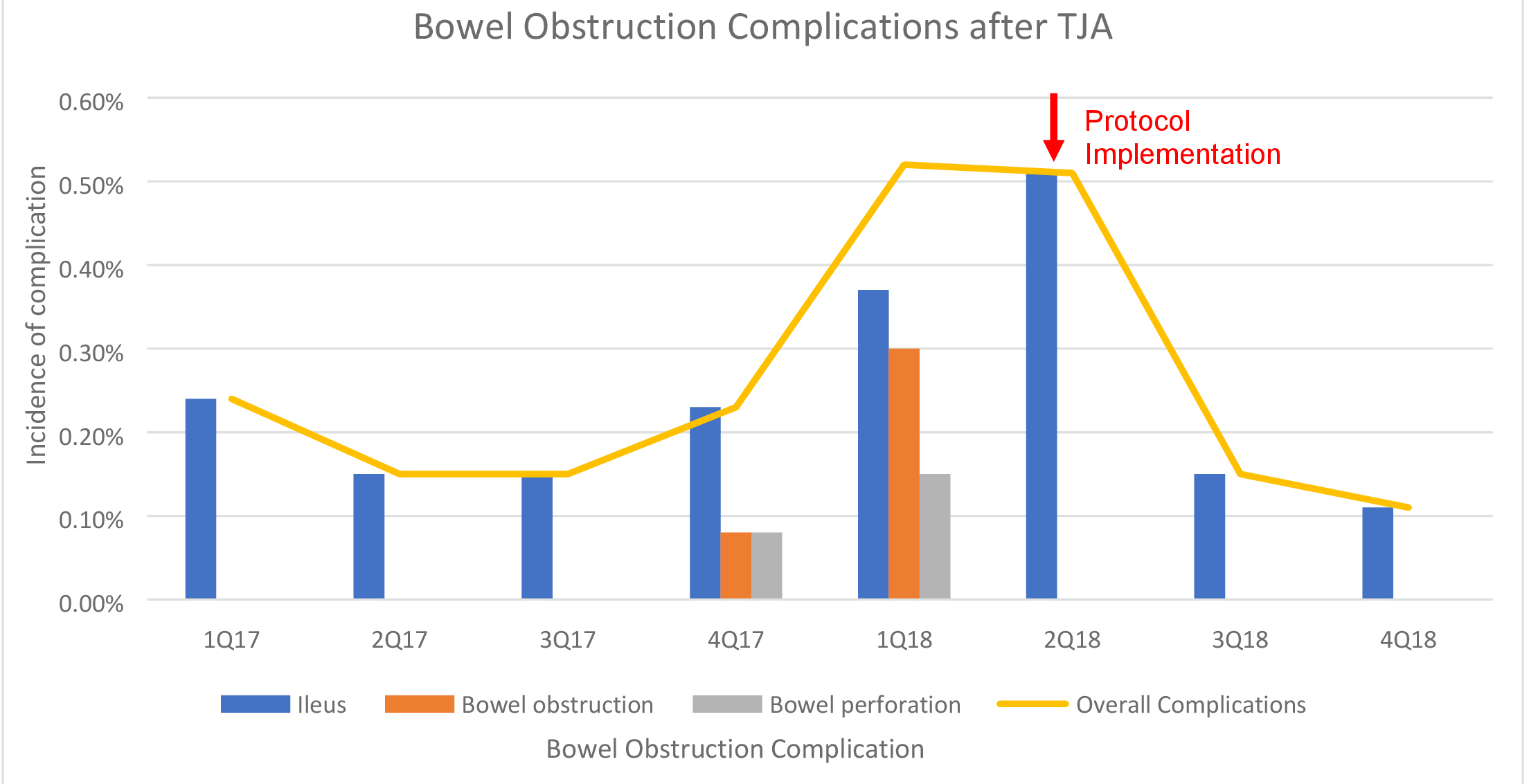 At our institution, an increasing trend of serious postoperative bowel obstruction complications after elective TJA was noted over a nine-month period from 2017 to 2018 (Figure 1). These cases were reviewed in depth and the observation led to an evaluation of current protocols in an effort to decrease the incidence of these events.