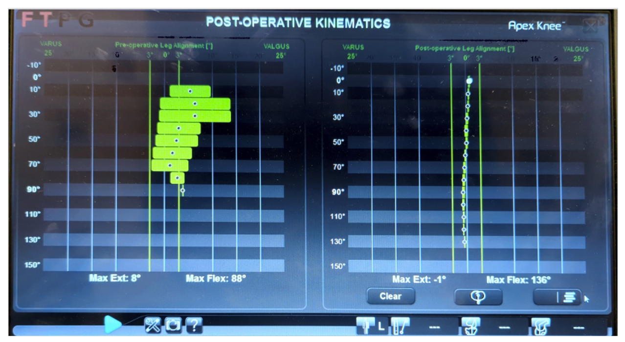 The patient was taken to the operating room (OR) electively, and a standard medial parapatellar approach to the knee was utilized. Exposure included a limited 2 cm soft tissue sleeve circumferential medial release, resection of the anterior cruciate ligament and posterior cruciate ligament and meniscal remnants, as well as removal of osteophytes from the femur, tibia, and patella. Two pins were placed in both the femur and tibia, respectively, and tracking arrays were securely fastened for the OMNIBot. Registration of the landmarks utilized by the OMNIBot was performed as previously described (Blum et al. 2021). A detailed video demonstrating the technique for using the OMNIBot system in conjunction with the BalanceBot device can be found online (https://vimeo.com/321724524). Following landmark registration, the left lower extremity was taken through a range of motion from the fullest extension that could be achieved to approximately 110 degrees of flexion and repeated with varus and valgus stress applied to the knee. The OMNIBot recorded the knee alignment and medial and lateral gaps throughout the range of motion, yielding the graph in Figure 3. During this step, the patella was kept reduced to ensure that all structures providing lateral restraint were accounted for. Regarding this patient, the graph demonstrated a 5-degree flexion contracture and valgus alignment in extension that did not correct with application of a varus force with a gradual improvement to neutral alignment in flexion.