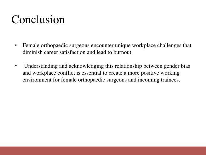 In conclusion, our study shows us that female orthopedic surgeons have unique workplace conflict that diminishes career satisfaction and yields to greater rates of burnout. It is important to understand the relationship between gender bias and workplace conflict to create a more positive working environment for female orthopedic surgeons and incoming trainees.