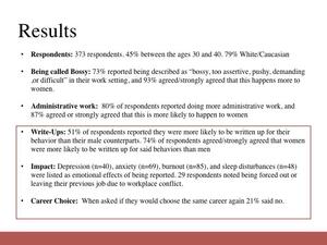 We had 373 respondents. The majority were between 30-40 years old and Caucasian which is consistent with the current workforce in the field. Of note, 73% reported being described as “bossy, too assertive, pushy, demanding or difficult” in the workplace, and 80% reported doing more administrative work than their male counterparts. 51% also answered that they were likely to be written up for behavior that their male counterparts had not been written up for. Surgeons who had been reported listed depression, anxiety, burnout, and sleep disturbances as emotional effects of the event. 29 respondents answered that they were forced out or left their previous job due to workplace conflict