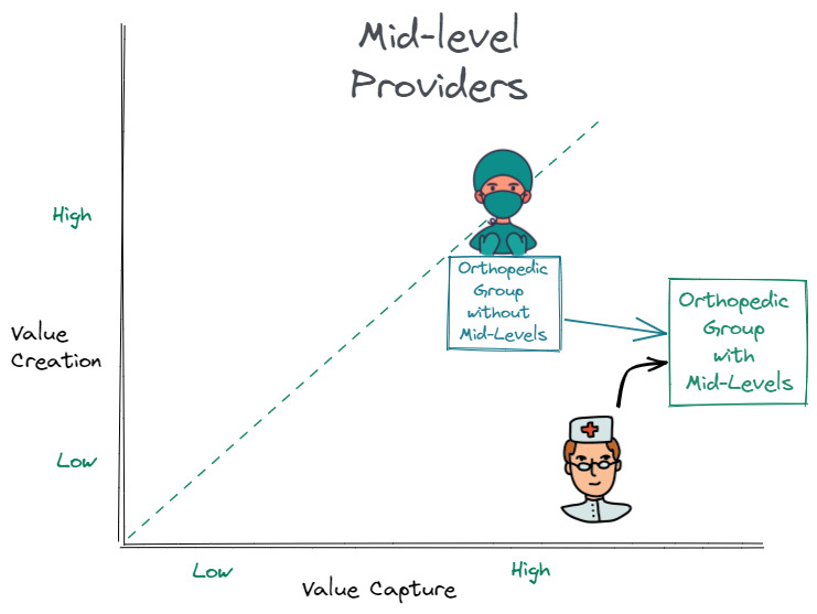 Orthopedic providers often hire mid-level associates (PAs, NPs) to practice healthcare at the top of their license and increase throughput through urgent care clinics. Mid levels increases value capture for the orthopedic providers. Value creation is slightly increased by improved access and slightly decreased by care delivery with a non-MD providers.