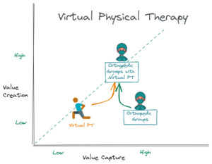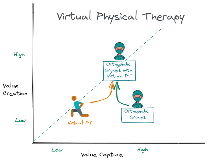Performing unnecessary surgeries or test increases value capture and decreases value creation which can be financially beneficial for a single provider in the short run, but is damaging to the provider group over the long run. By contrast, valued based care increases value creation and decreases value capture which can be financially harmful in the short run, but builds brand and relevancy for the group over the long run. For orthopedic groups that are only trying to maximize revenue, moving from fee for service with unnecessary procedures to value based care is challenging. Surgeons feel like status quo will never change, and therefore there is no reason to pursue any change that may decrease revenue. Unfortunately, these DTx companies offer value based care that is catching on with employers. Status quo has already changed. We just don’t want to accept it.