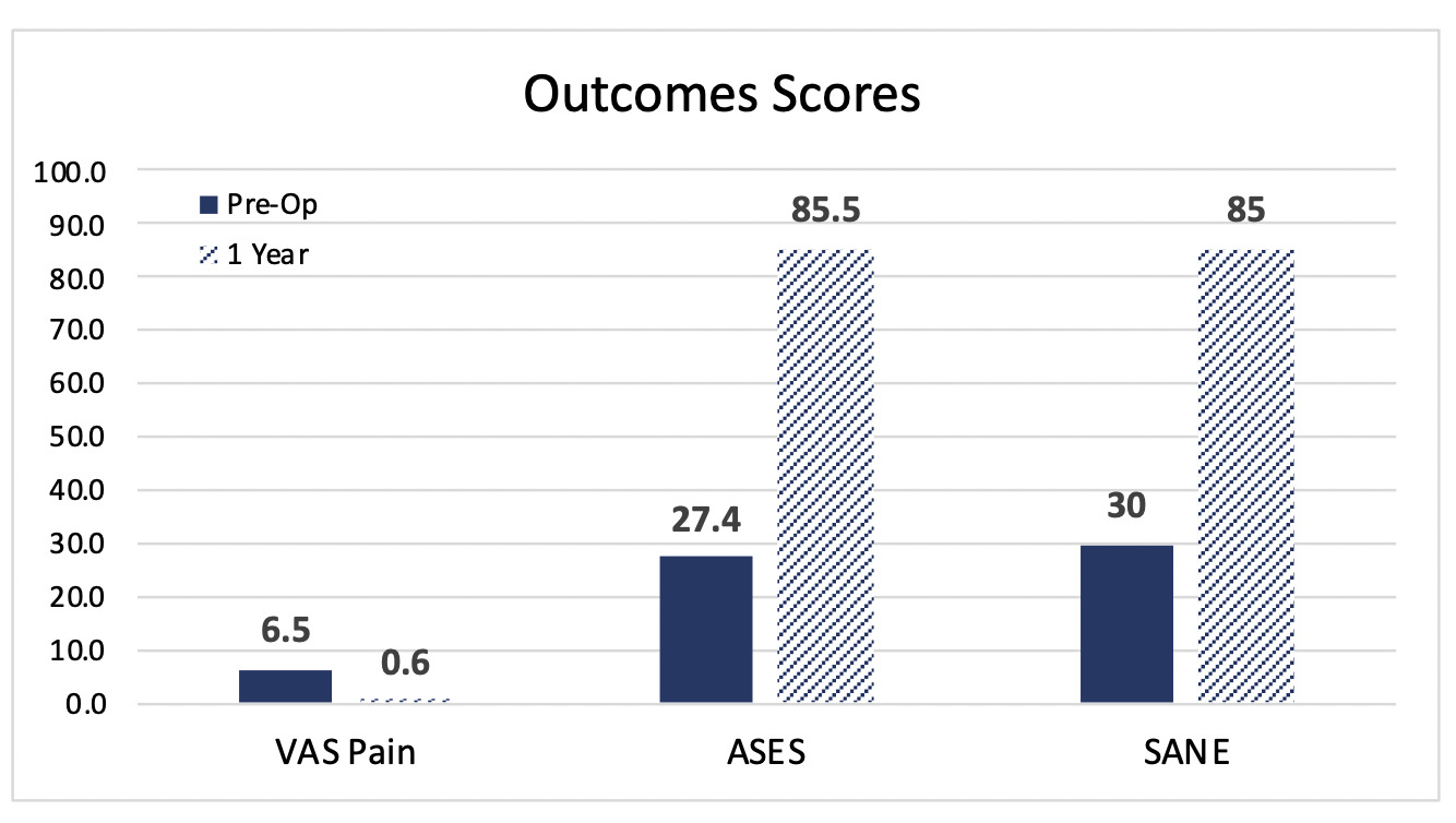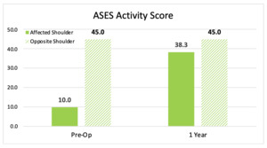 Patient reported outcomes using Visual Analog Scale (VAS), American Shoulder and Elbow Surgeons (ASES) Shoulder Score, and Single Assessment Numeric Evaluation (SANE) were assessed before the index procedure and at 1-year follow-up. Shoulder pain and function showed marked improvement over the 1-year postoperative period. ASES activity scores were used to compare the affected shoulder to the opposite shoulder (Figure 5). The change in scores over time demonstrates that the operated shoulder is nearing the activity level of the opposite shoulder. When comparing preoperative vs. postoperative scores, the VAS pain score, ASES, and SANE all showed improvement at the 1-year follow-up point (Figure 6).