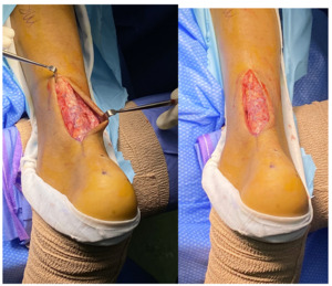A 31-year-old male presented with a chronic tear in the midsubstance of his right Achilles tendon. The patient had no active motion and walked with a “slapping foot gait.” His pre-operative dorsiflexion was 4-/5+ and he had no strength in plantar flexion. MRI of the tendon showed cavitation and infiltration of dense fibrous tissue indicative of the chronic nature of this rupture with the likelihood of poor-quality tissue (Figure 1). The middle of the tendon consisted of degenerative, retracted tissue. Scarring was likely due to the fact that 8 weeks had elapsed since the time of injury.