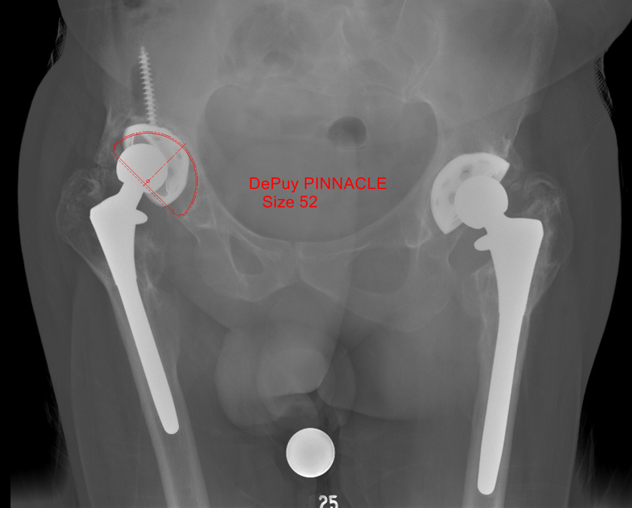 The second broken cancellous dome screw was identified. The broken screw removal set could not be utilized due to the angle of the screw. Instead, an osteotome and vice grips were used to successfully remove the cancellous screw without significant bone loss. Gentle reaming proceeded up to the size 51 mm reamer. Autograft was utilized to reverse ream into the segmental and contained defect within the acetabulum. A 52 mm Pinnacle multi-hole with Gription acetabular cup (Depuy Synthes, Warsaw, IN) was impacted into 20 degrees of forward flexion and 40 degrees of abduction (Fig. 3). The acetabular cup had a primary impaction bite and was quite stable. The position of the acetabular cup was confirmed using intraoperative fluoroscopy and software that digitizes radiographs to determine positioning of the acetabular component. The acetabular cup was further secured with five 6.5mm cancellous dome screws. A 32mm head was chosen secondary to the constraints on the 10/12 femoral stem taper. A 32mm neutral AltrX polyethylene liner (Depuy Synthes, Warsaw, IN) was impacted into place. A 32mm +5mm offset PFC femoral head (Depuy Synthes, Warsaw, IN) was impacted onto the trunnion.