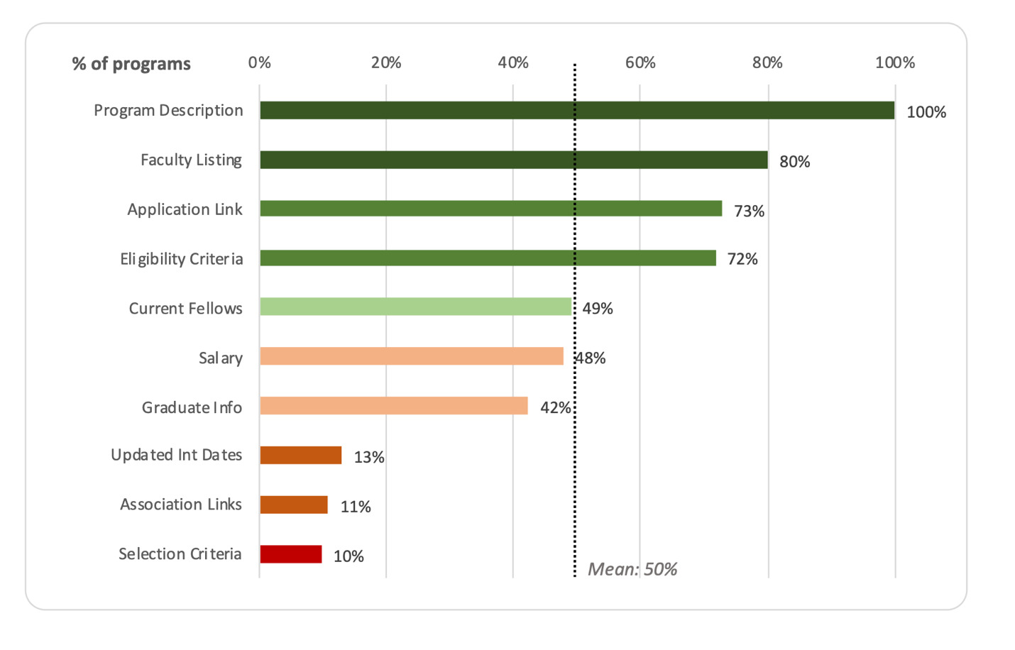 The ASSH fellowship directory and its entries on individual programs were queried on January 1st, 2022. Individual hand fellowship websites as linked from the ASSH directory or, if the link was unavailable or broken, found via a Google search of ‘[program name]+hand surgery fellowship website.’ Relevant subpages were evaluated between January 1st and February 8th, 2022. Institutional Review Board approval was not required for this study as only publicly available data were queried. Data extraction Data on 38 metrics were recorded for each individual program. These include 32 analyzed by Silvestre et al in their 2015 study (Silvestre, Guzman, Abbatematteo, et al. 2015) replicated for comparison and supplemented by 6 others for deeper evaluation. Data were grouped into four different content categories: (i) General Overview, (ii) Accessibility Information, (iii) Educational Information, and (iv) Recruitment Information (Supplementary Table S1). The “(i) General Overview” section includes the following 12 variables: ASSH fellowship directory presence, Fellowship and Residency Electronic Interactive Database Access System (FREIDA; online database of over 8700 graduate medical education programs accredited by the Accreditation Council for Graduate Medical Education [American Medical Association 2022]) presence, orthopaedics resident eligibility, plastics resident eligibility, general surgery resident eligibility, region (Administration USEI 2022), number of fellow positions per year, affiliation with a US News & World Report (UNWR) top-20 medical school (US News & World Report 2022c), affiliation with a UNWR top-20 hospital (US News & World Report 2022a), affiliation with a UNWR top-20 orthopaedics hospital (US News & World Report 2022b), acknowledgement of the impact of COVID-19 on the fellowship experience, and acknowledgement of the impact of COVID-19 on the fellowship application process. The “(ii) Accessibility Information” section includes the following 6 variables: ASSH fellowship website link status, FREIDA fellowship website link status, comparison of website and ASSH- reported interview dates, comparison of website and true interview dates as reported by program coordinators, supplemental application requirements, and obsolete paper application information. Supplemental application requirements were defined as those besides the universal requirements listed on the ASSH website, such as an applicant’s Medical Student Performance Evaluation (MSPE)/Dean’s Letter, official medical school transcript, or medical school diploma copy. As in 2015 (Silvestre, Guzman, Abbatematteo, et al. 2015), “(iii) Educational Information” section includes the following 10 variables: evaluation criteria, on-call requirements, meetings attended, rotation overview, research information, journal club, didactic learning, academic conferences, affiliated hospitals, and operative experience. As in 2015 (Silvestre, Guzman, Abbatematteo, et al. 2015), “(iv) Recruitment Information” section includes the following 10 variables: selection criteria, association links, recent graduate information, salary, current fellow information, ASSH application link, eligibility criteria, faculty listing, program description, and updated interview date presence. Interview dates were considered updated if the dates corresponded to the 2022 application cycle.