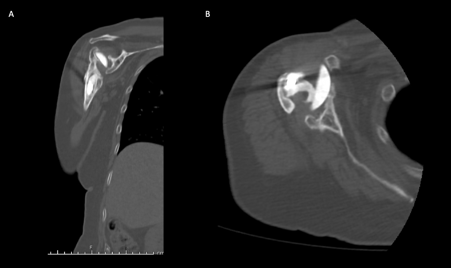 A 69-year-old woman presented after resection arthroplasty of her right shoulder hemiarthroplasty and completion of antibiotic treatment for culture negative PJI for evaluation of reconstructive options. She had a history of a displaced two-part right proximal humeral fracture which was repaired with an intramedullary nail. Post operatively, she had persistent pain and CT scan of the shoulder showed two screws in the humeral head that extended through the cortex and into the glenohumeral joint. The screws were removed and replaced with smaller screws. Subsequently, she had non-union of the fracture in the setting of deltoid weakness and was revised to a right hemiarthroplasty (Figures 1-3). Post operatively, she had persistent pain refractory to physical therapy and diminished function that was impacting her quality of life. She sought subsequent care, and there was concern for arthroplasty failure secondary to a septic versus aseptic condition and the decision to proceed with resection arthroplasty was made. During resection arthroplasty, a significant amount of fluid was expressed from the joint space. The combination of the clinical picture of progressive and persistent pain and the gross expression of fluid were concerning for PJI and the decision to treat was made. It was felt that the extent of humeral bone loss did not allow for a stable cement spacer, so none was placed. Intraoperative joint fluid cultures, anaerobic, and fungal cultures were all negative for growth. Cultures were held for 21 days to rule out C. Acnes infection. Considering the plan for future reimplantation, infectious disease consultation recommended a 6-week course of vancomycin but after 2 days the patient had a transfusion reaction and was switched to daptomycin. She was left with markedly limited active motion associated with severe pain. After completion of the antibiotic course, the patient elected to proceed with revision surgery. This patient had a flattened and distorted glenoid and atrophied rotator cuff musculature demonstrated prior to resection arthroplasty on CT (Figure 4). This patient’s prior hemiarthroplasty had been a tantalum coated, cemented humeral stem with associated marked thinning of the humeral cortex even prior to resection arthroplasty, and this resulted in a large amount of proximal humeral bone loss during the resection (Figure 5). The patient was severely debilitated by the right shoulder and wanted to proceed with reconstruction. Because of the combination of glenoid and humeral bone loss and the lack of rotator cuff attachments, a custom constrained prosthesis design process was initiated, and the implant was available 16 months after the resection arthroplasty. Preoperative 3 phase SPECT (Single Photon Emission Computed Tomography) three phase bone scan, upper extremity CT, and blood work (WBC 5.4, ESR 9, CRP 0.8) showed no suggestion of active infection.